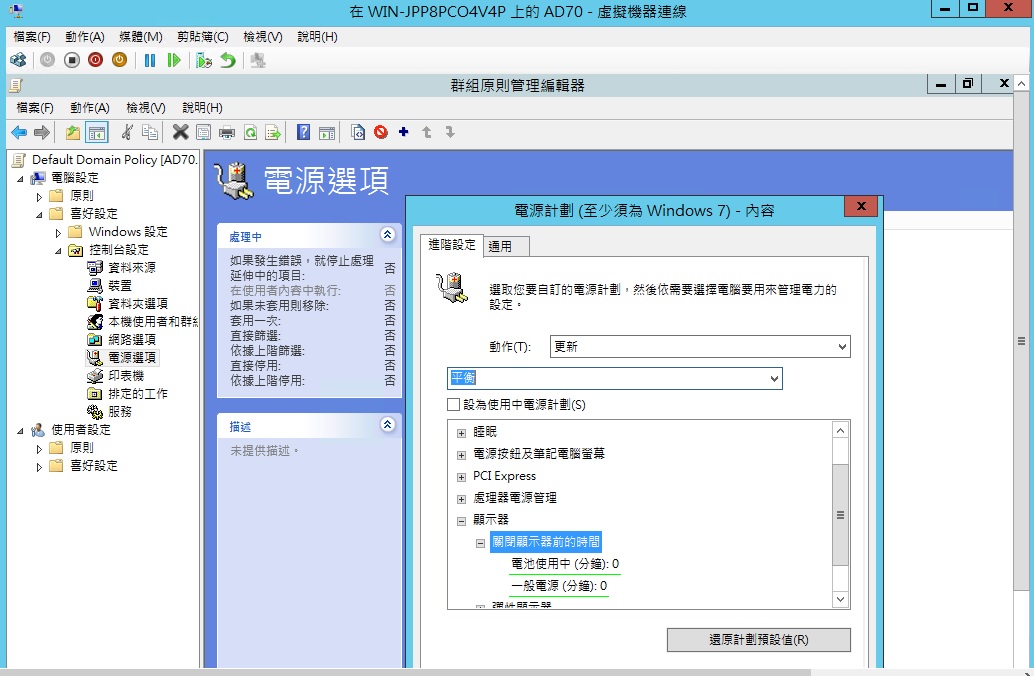 執行 群組原則管理 (Gpmc.msc) 點選 電腦設定 點選 喜好設定 點選 控制台設定 點選 電源選項 (右鍵) 新增 電源計畫 (至少須為 Windows 7) 選擇 動作(更新) 平衡 高效能 (模式) 點選 顯示器 (關閉顯示器前的時間) [ Ps. 設定 0 為不關閉顯示器 ]