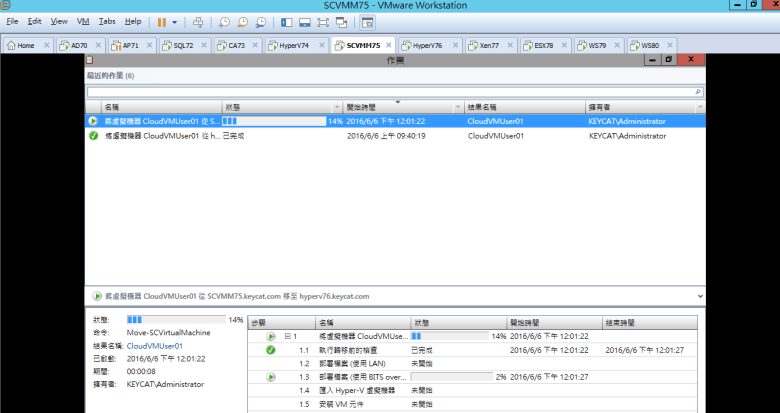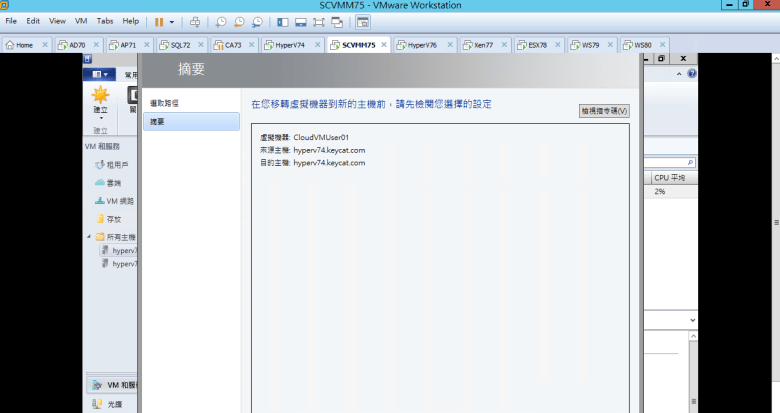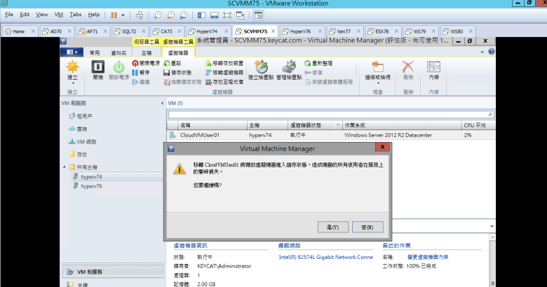 確定 虛擬機器 從 HyperV74.keycat.com 移轉至 HyperV76.keycat.com 進行中