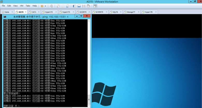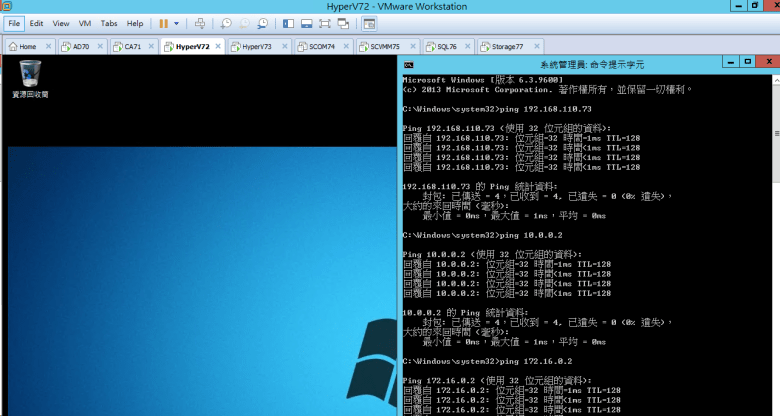 輸入 Ping 192.168.110.72 (HyperV72 正常)