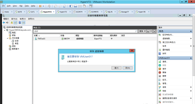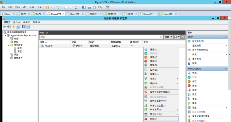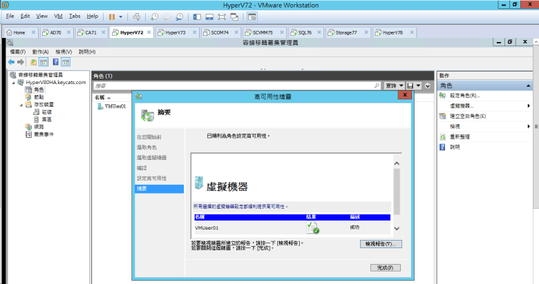 確認 角色 (VMUser01) 擁有者節點 為 (HyperV72)