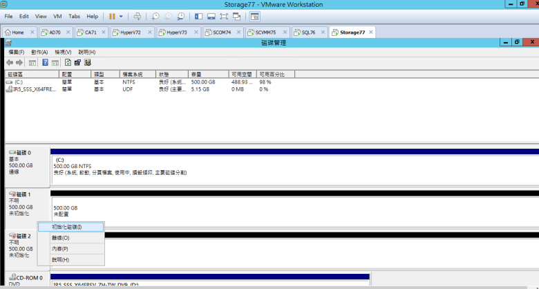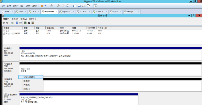點選 (磁碟 1 和 磁碟 2) 右鍵 初始化磁碟