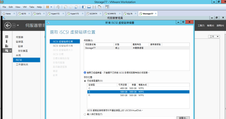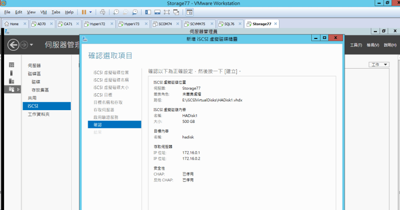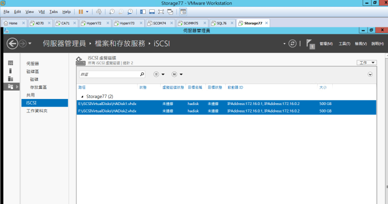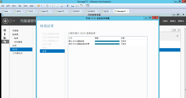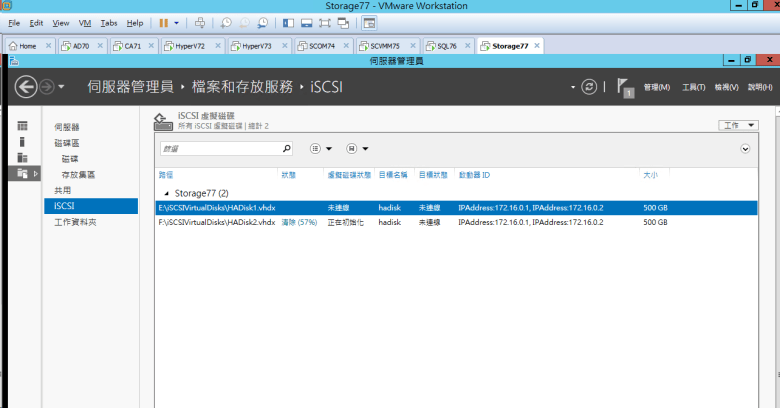 確認 Storage77 的 iSCSI 虛擬磁碟 (需 狀態為 “清除" 完畢)