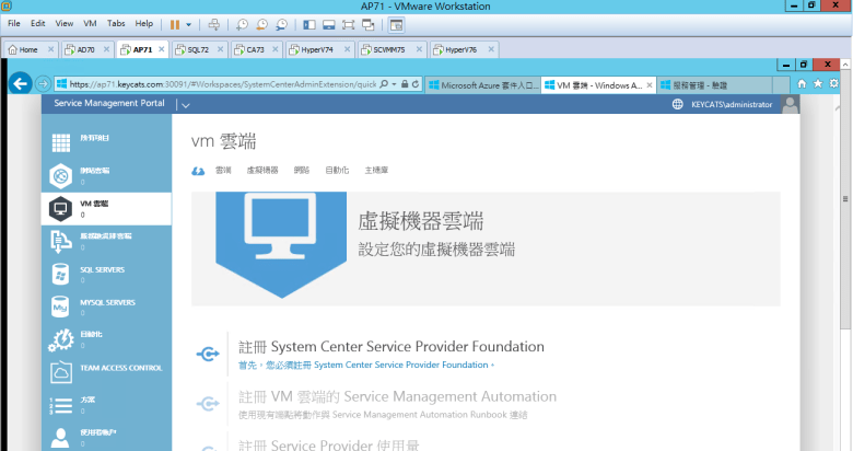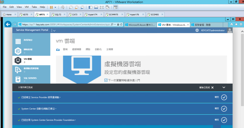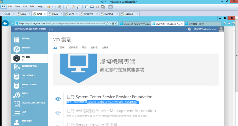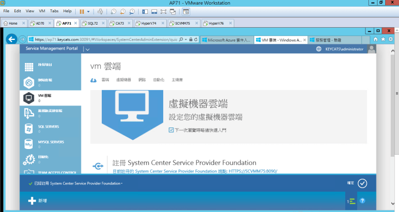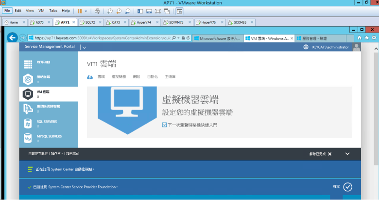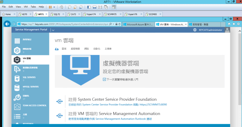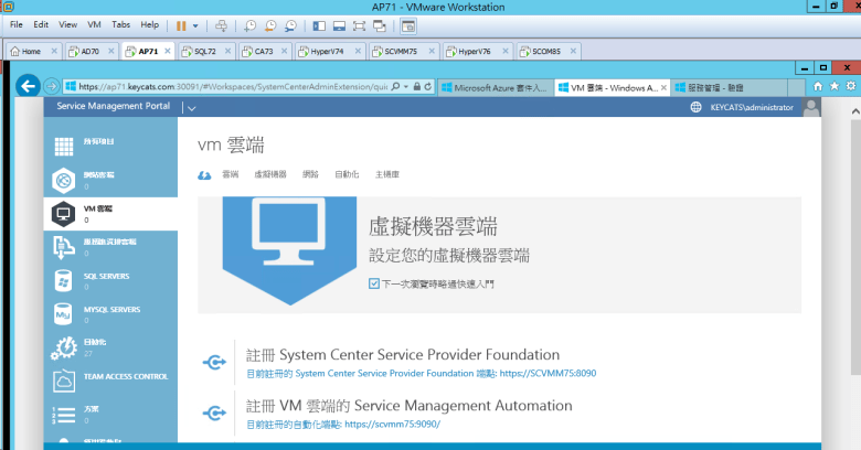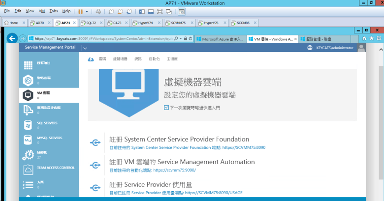 [ 更改 Azure Pack Portal 連結 https://AP71.keycats.com:30091/#Workspaces/SystemCenterAdminExtension/quickStart ]