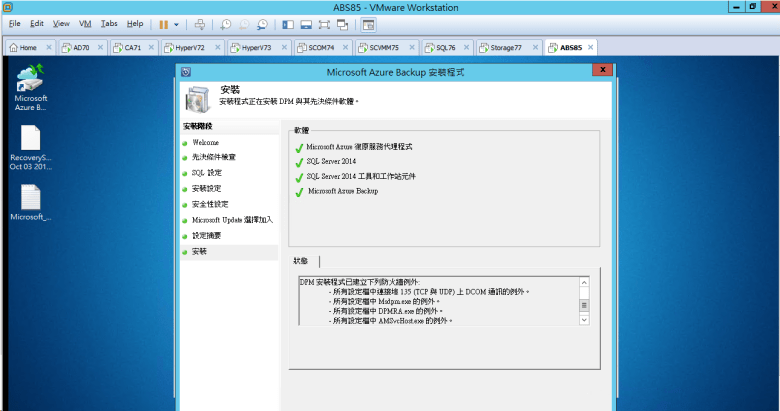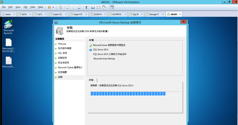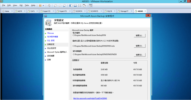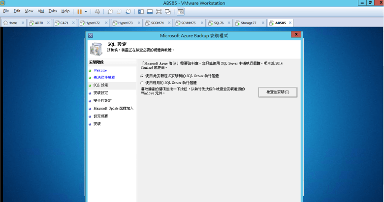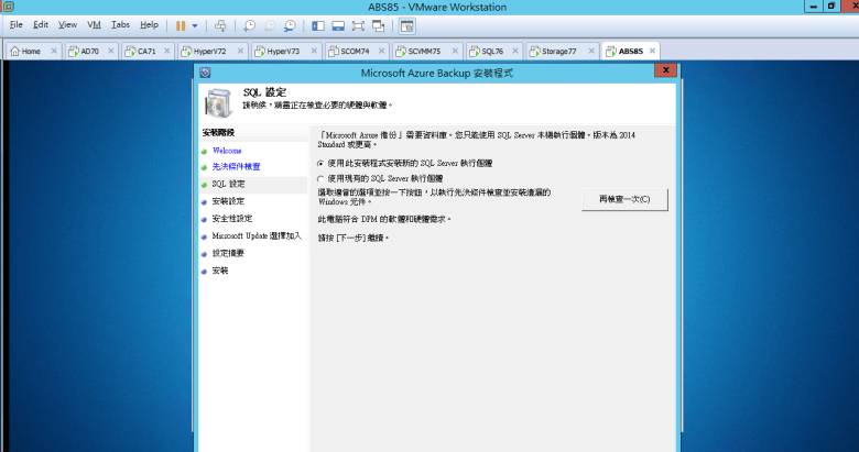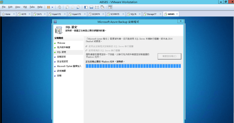 安裝 Microsoft Azure Backup Server (需要有 SQL Server 2014 Standard 或 “更高" 版本)