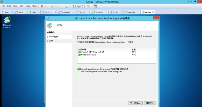 出現 “Microsoft Azure Recovery Services Agent 安裝作業已成功完成"