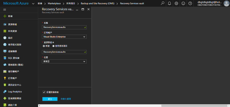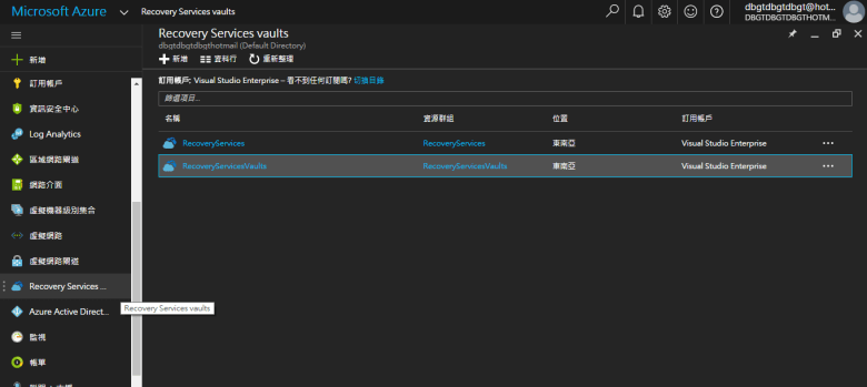 點選 Recovery Services vaults (已建立服務 資源群組 名稱位置)