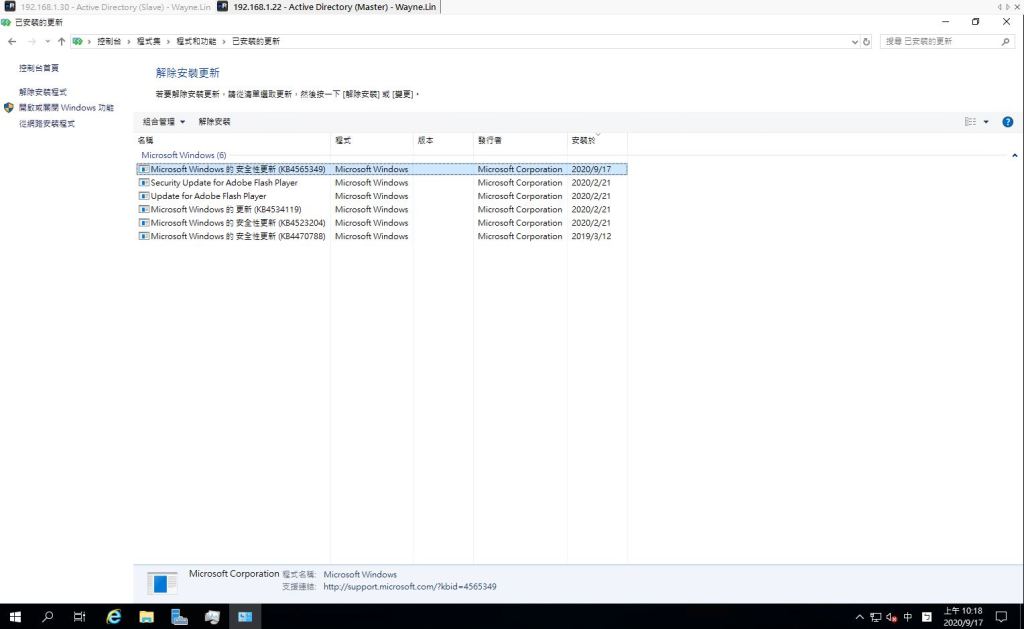 確認 已經新增 Microsoft Windows 的 安全性更新 (KB4565349)